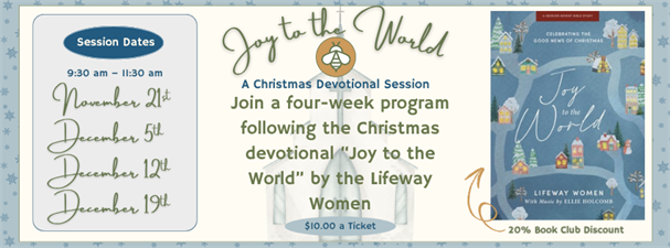 Join us for a four-week program following the Christmas devotional Joy to the World by the Lifeway Women, celebrating Christmas & the life of Christ. Our first meeting is on November 21st. All are welcome. There is a $10 entry fee, which can be used as in-store credit, and the book can be purchased for $20 at your 1st session.