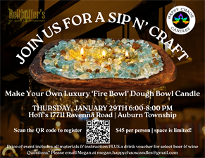 Make it a night out with friends and craft your own exclusive "Fire Bowl" Dough Bowl Candle! Tailor it to your taste by choosing your preferred scent, fire pit glass hue, and embellishments. Admission grants you a complimentary drink coupon for speciality beer or wine to enhance your experience. Choose from a selection of indoor scents